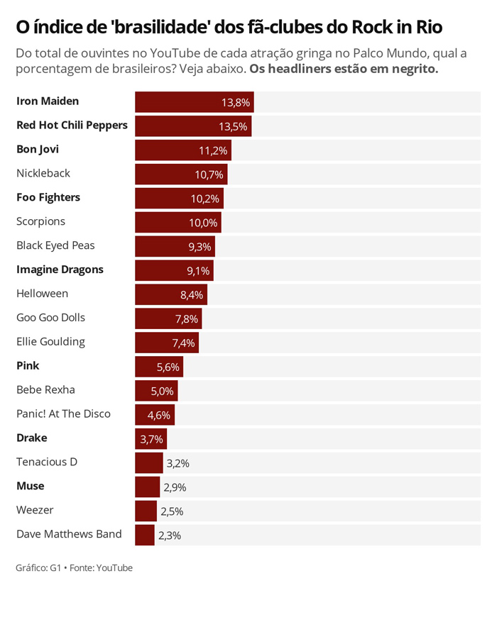 Por outro lado, o Brasil tem fatia pequena entre o público das atrações principais de pop (Pink, com 5,6% e Drake, com 3,7%) e bandas ligadas ao indie rock (Weezer, com 2,5%, e Muse, com 2,9%). O levantamento considerou acessos nos últimos 12 meses.