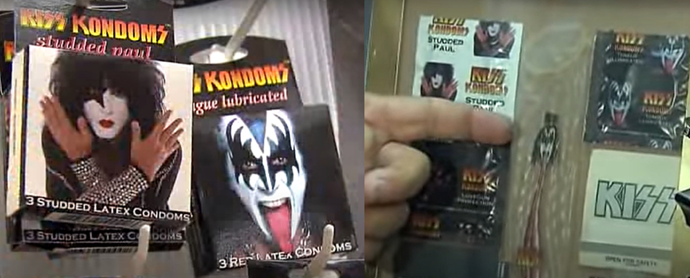 Lançadas em 2002, as camisinhas do Kiss tinham duas versões: a linha “Língua lubrificada”, com a estampa do rosto de Gene Simmons na embalagem e no próprio preservativo, e Studded Paul com o vocalista. As KISS Kondom também saíram de linha, mas ainda podem ser encontradas em lojas virtuais, mas apenas como item de colecionador, pois estão fora da validade.
