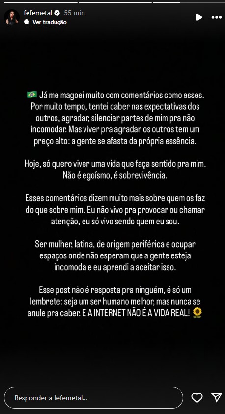 Ela escreveu – transcrição RockBizz: “Já me magoei muito com comentários como esses. Por muito tempo, tentei caber nas expectativas dos outros, agradar e silenciar partes de mim para não incomodar. Mas viver para agradar os outros tem um preço alto: a gente se afasta da própria essência.