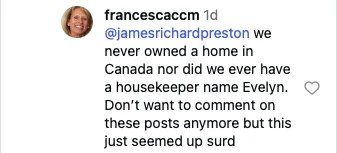 A ex-esposa de James esclareceu o seguinte: “Nós nunca tivemos uma casa no Canadá, nem nunca tivemos uma empregada chamada Evelyn. Não quero mais comentar nessas publicações, mas isso me pareceu absurdo”.
