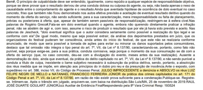 O advogado explica ainda que “não houve, portanto, qualquer prática criminosa por parte do Natanael Júnior com o intuito de lesar o consumidor. Tudo aquilo que foi anunciado para o evento denominado de MOA foi, de fato, programado e teve todos os seus custos arcados por Natanael Júnior, como está comprovado nos autos do processo, e todos os atos foram por ele praticados para que tudo fosse entregue ao público que ali compareceu. Tudo isto ficou tecnicamente comprovado ao longo de todo o processo e devidamente reconhecido em sentença de mérito. O magistrado tinha em mãos todos os elementos necessários para absolver o Natanael Júnior, e assim o fez por meio de uma sentença minuciosamente fundamentada”.