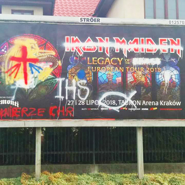 Um outdoor que promovia os shows do Iron Maiden foi pichado, teve o nome da banda riscado e uma cruz e siglas católicas foram desenhadas no anúncio.