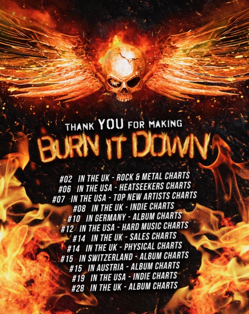 Além do giro europeu, o grupo anunciou que o novo disco, Burn It Down, tem alcançando ótimos números nas paradas musicais como #6 na US Billboard Heatseekers; #10 German Media Control; #12 US Hard Music Charts; #14 UK Sales e #15 nas paradas suíças e austríacas.